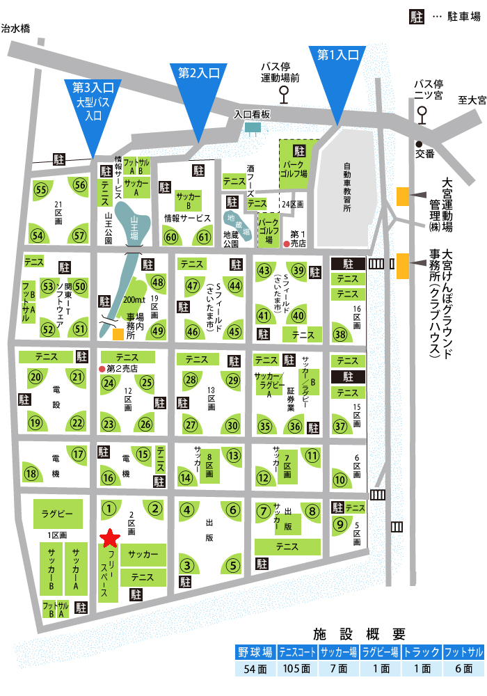 | アクセス | 【公共交通機関でお越しの場合】 バス)JR大宮駅 西口を出て、西武バス1番乗り場から<ららぽーと富士見 行き>または<馬宮団地 行き>へ乗車し、「運動場前」で下車(所要約20分) ※時刻表に「ら」「馬」の表示があるバスのみ運動場前まで行きます。 バス)JR大宮駅 西口を出て、西武バス1番乗り場から<二ツ宮 行き>に乗車し、「二ツ宮(終点)」で下車、徒歩5分 ※施設が非常に広いため、バス停から会場(フリースペース)まで徒歩で約20分ほどかかります。 【お車でお越しの場合】 国道17号線 新大宮バイパスの三橋交差点を所沢方面に曲がってください。 ※運動場内各所に専用駐車場(無料)がございます。 |