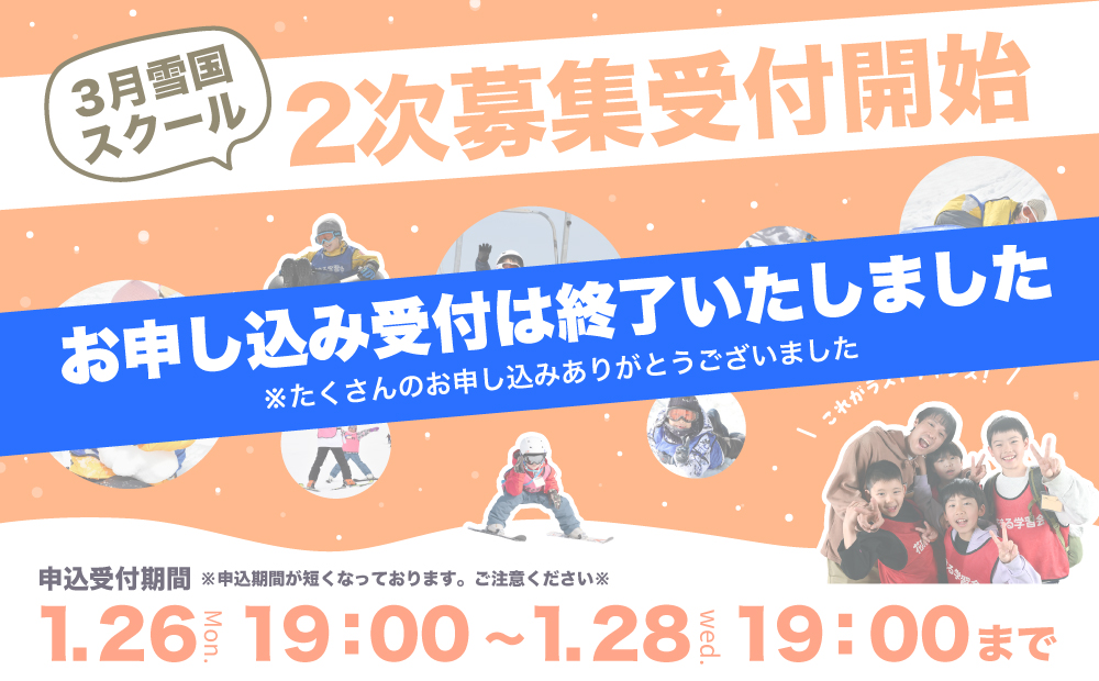2026.01.28 3月雪国スクール、2次募集申し込みエントリー受付終了