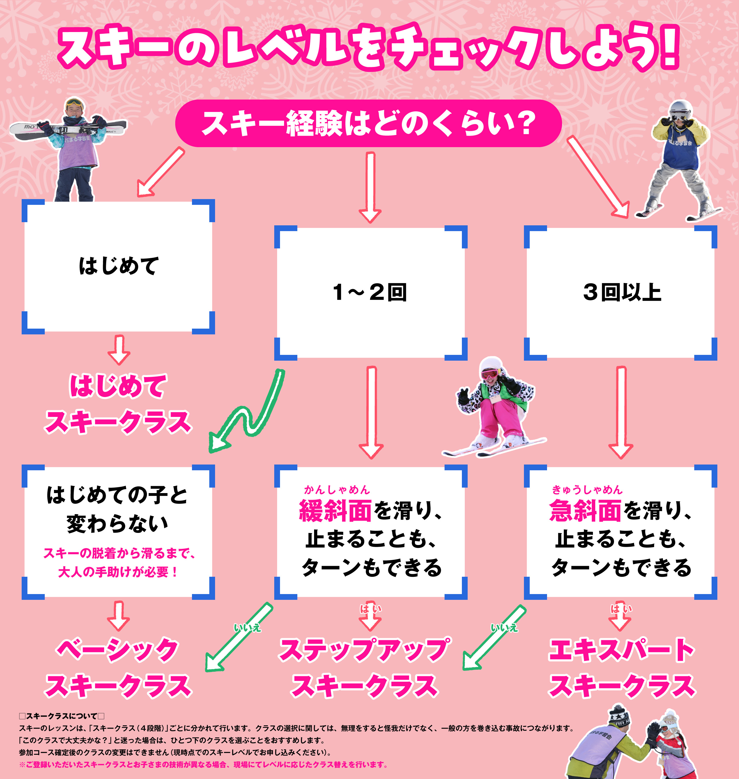 スキークラスは「はじめて」「ベーシック」「ステップアップ」